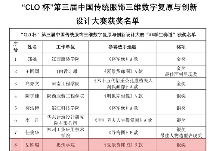 本网讯 11月24日,第三届“CLO杯”中国传统服饰三维数字复原与创新设计大赛获奖名单揭晓。我校服装学院岳欧璐老师的作品《夏景货郎图》B款在非学生赛道中荣获银奖。这一成绩既是对教师个人专业能力的认可,也是我校服装学科教学实力与文化传承成效的集中展现。