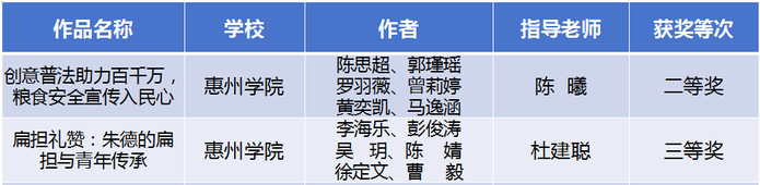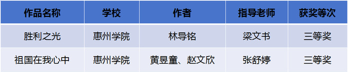 本网讯 近日,广东省教育厅正式公布2025年“立志·修身·博学·报国”主题教育系列活动评选结果。我校师生凭借深厚的专业素养、鲜活的创作理念与浓厚的家国情怀奋勇争先,在全省众多参赛单位中脱颖而出,一举斩获13项荣誉,其中一等奖2项、二等奖3项、三等奖8项,充分展现了惠院师生良好的精神风貌与扎实的综合素养。