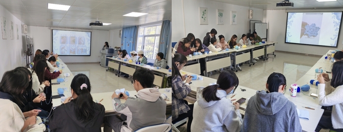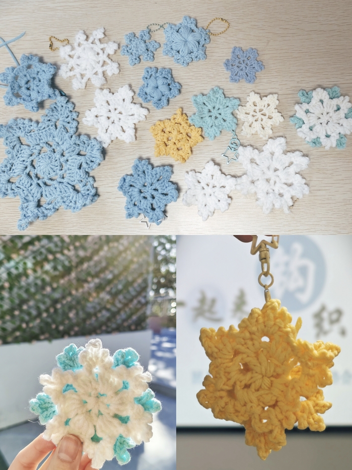 在教育科学学院黄于蓝、经济管理学院谢金汝、地理与旅游学院刘菲菲、服装学院张静兰四位朋辈达人的耐心指导下,同学们学习钩针基础技法,一步步将柔软的毛线转化为精致的雪花片。