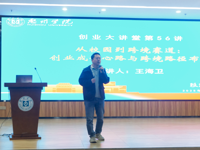 本网讯 12月10日,惠州学院“创业大讲堂第56讲”在旭日科技大楼A座201会议室成功举办。本次讲座以“从校园到跨境赛道:创业成长心路与跨境路径布局”为主题,特邀服装学院2000级优秀校友、众一跨境CEO王海卫先生担任主讲嘉宾,为师生带来一场兼具思想深度与实践价值的创业盛宴。此次活动由服装学院副院长索理主持,学院党委书记张小琨,党委副书记、院长陈学军,党委副书记李少璃,各系相关负责人,师生代表等近300人共同参与。