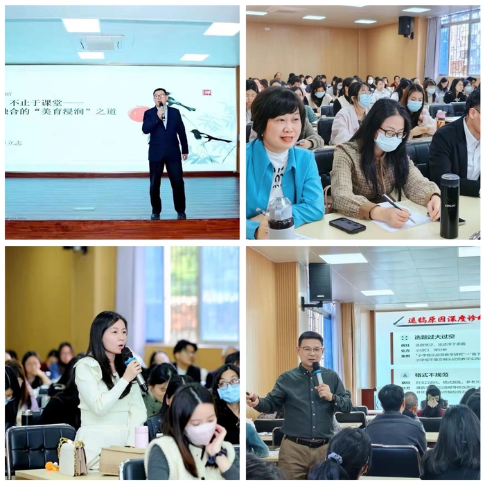 李立志博士作题为《美育,不止于课堂——学科融合的“美育浸润”之道》的专题讲座。他从终身学习与终身审美的理念出发,指出美育课堂应具备愉悦、和谐、共鸣的特质,打破美育局限于艺术课堂的传统认知。讲座系统阐述了美育浸润的实践逻辑,深入剖析了其核心内涵与师生美育素养的培养路径,指出美育是贯通各学科、提升教育品质的重要支撑,学科融合应致力于实现知识贯通与情感共鸣。他提出“漫灌、浇灌、滴灌”的美育浸润方法,倡导教学应做到知行统一,并以美育浸润心灵、启迪智慧、塑造人格、促进劳动教育与身心发展为主题,分享了一系列具有操作性的教学实践策略,指出应将审美能力与创新精神需融入日常教学全过程。
