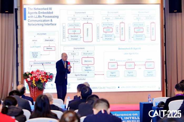 在主旨报告环节,澳门科技大学张宏纲教授以《Agentic AI, AI-RAN and Future 6G》为题,详细阐述了大语言模型驱动的Agentic AI在新一代通信与计算网络中的核心作用。他指出,通过云—边—端协同架构实现异构计算与通信资源的高效整合,是构建AI原生6G网络的关键途径。张宏纲还介绍了面向6G的网络化AI智能体环境、MCP与A2A协议及AI-RAN的最新技术进展,为智能通信网络的发展提供了前瞻性思路。