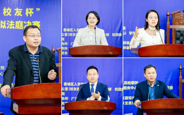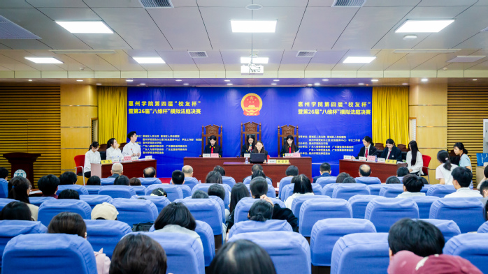 本网讯 12月10日下午,政法学院在图书馆学术报告厅举办惠州学院第四届“校友杯”暨第26届“八维杯”模拟法庭决赛。副校长魏晓慧,惠城区人民法院四级高级法官贺晔晖,惠城区人民检察院三级检察官郭灏,广东八维律师事务所律师范桂香、钟妙玲,广东震铄律师事务所主任李勇林,广东宝晟律师事务所主任黄伟粦,广东人为律师事务所主任欧阳俊胜等嘉宾,以及学校总法律顾问陈刚、相关职能部门负责人以及校友代表等出席活动。