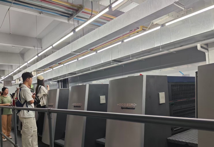 企业负责人现场讲解了四色印刷原理、专色调配、纸张特性及特殊印刷工艺等专业知识,并针对学生设计作品中易出现的印刷误区进行分析与指导。他强调,优秀的设计必须建立在对工艺的深刻理解之上。通过亲历从创意到成品的完整工序,学生们进一步认识到设计与印刷衔接的重要性,加深了对行业实践的理解。