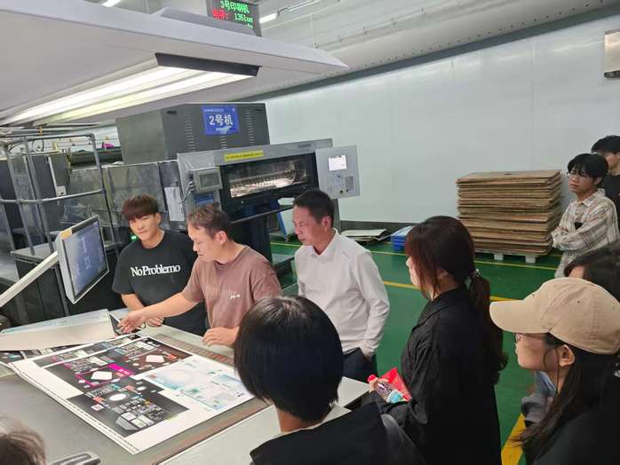 在企业负责人的带领下,师生们首先参观了企业展厅。展厅陈列了各类创意画册、精品包装、文创产品及采用烫金、UV、立体起凸等多种工艺的印刷样品。学生们认真观摩,并结合设计课程内容,就设计稿到成品的工艺实现细节与企业技术人员进行交流,加深对印刷品从电子设计到实体成品的转化过程的直观认识。