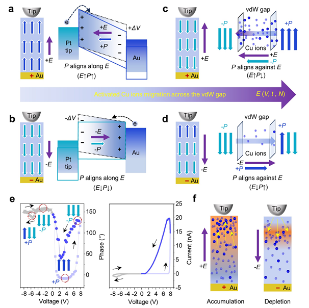 首篇论文聚焦铁电离子材料CuInP2S6独特的铁电-离子耦合特性,揭示了铜离子层内与层间迁移形成的四重势阱态,阐明了铁电开关与离子迁移的耦合机理和电导机制,实现了从铁电主导到离子迁移主导的可控导电性机制切换,为新型低耗神经形态计算器件研发提供了核心理论支撑。