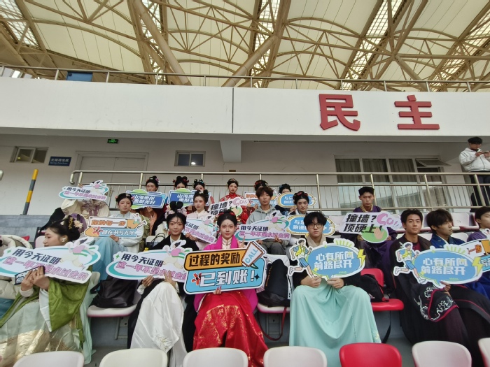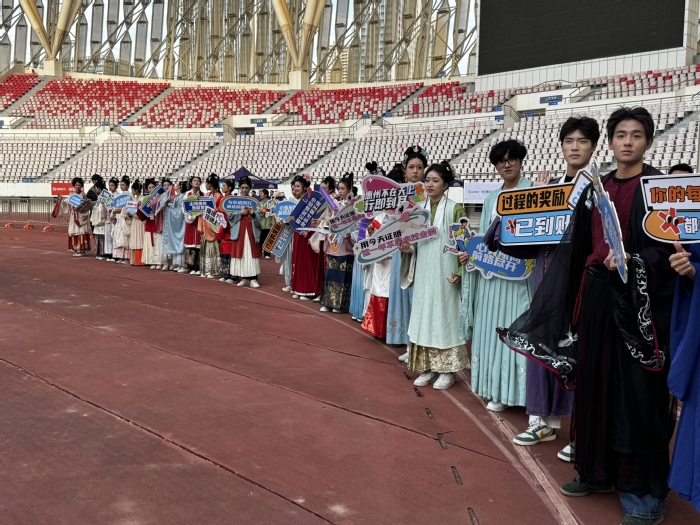 表演专业学生身着涵盖不同朝代与风格的系列汉服,以整齐划一的动作、昂扬向上的姿态,在终点区域为每一位冲线选手热情助威、送上祝福。她们专业的形象和富有感染力的表现,不仅成为现场媒体关注的焦点,更赢得了参赛选手和观众的一致好评,生动展现了我校学子良好的精神风貌与专业素养。