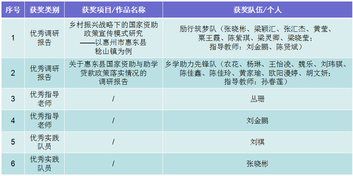 本网讯 近日,广东省教育厅公布2025年“国家资助和助学贷款政策下乡行”活动总结结果。我校推报的三个实践项目全部顺利结项,并累计荣获6项奖项,包括优秀调研报告2篇、优秀指导老师2人、优秀实践队员2人,展现出学校在国家资助政策宣传与实践育人方面的扎实成效。