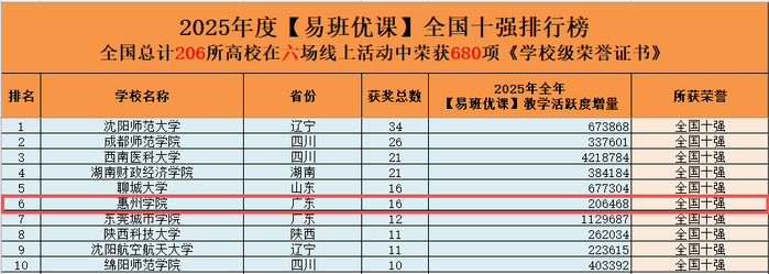 本网讯 近日,2025年度“易班优课”建设全国总排行结果正式公布,我校荣获2025年度全国易班共建高校“易班优课”建设“全国十强”荣誉。据悉,2025年易班在全国高校发起六场线上学习及评比活动,按照比赛规则,我校易班发展中心在全年系列活动中以获奖总数16项、全国排名并列第五,广东排名第一的优异成绩,首次获此殊荣。