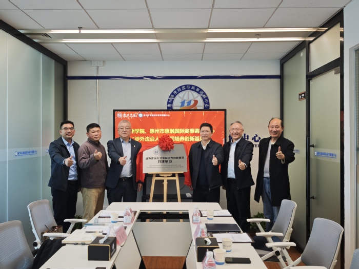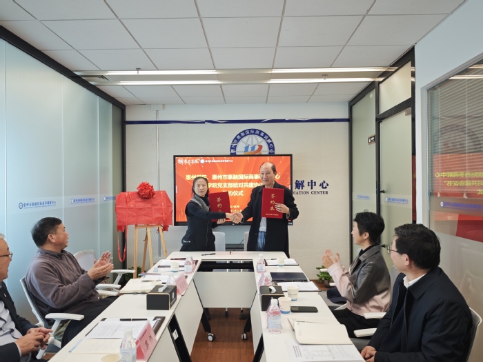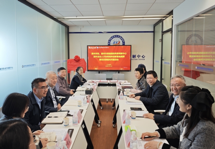 本网讯 1月14日上午,政法学院党委书记兼院长蒋炜率队赴惠州市惠融国际商事调解中心,开展“访企拓岗”专题调研。双方共同举行涉外法治人才协同培养创新基地揭牌仪式,并签署党支部结对共建协议。学院党委组织员李富明、党委副书记刘华、法律系主任黄明慧、教工第一党支部书记陈新华和教师代表,惠州市惠融国际商事调解中心理事长危兆宾、党支部书记马德斌和调解中心相关负责人参加活动。