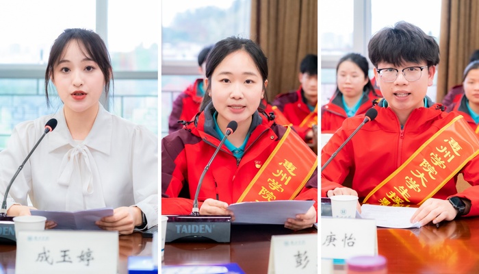 音乐学院学生成玉婷代表我校第十六批援藏支教队汇报了我校2025年下半年教育援藏情况,分享了队员们在雅鲁藏布江畔耕耘三尺讲台、用爱浸润雪域桃李的动人故事。第十七批援藏支教队队长彭文培和第一批援黔支教队队长张庚怡同学分别发言。他们表示,将带领队员深入西部基层,用脚步丈量山野,用知识点亮梦想,以实际行动书写惠院青年的奋斗底色,在祖国最需要的地方绽放青春。