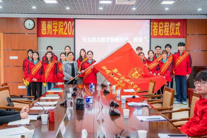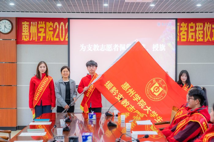 会上,魏晓慧为第十七批援藏支教队(前往西藏林芝市朗县)和第一批援黔支教队(前往贵州黔西南州册亨县)的志愿者们逐一佩戴绶带并授队旗。她勉励全体队员珍惜支教时光,将对教育事业的热忱切实转化为站稳三尺讲台的扎实行动,用心用情为当地孩子带去实质性帮助,在奉献基层的实践中展现惠院学子的青春风采。