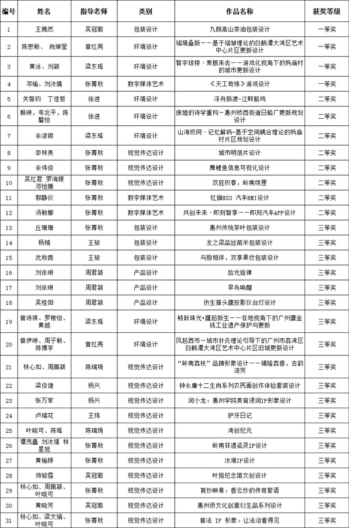 参赛作品深度扎根惠州本土文化,围绕历史街区、乡土村落、红色文化、地方IP、非遗传承等内容展开创作,既彰显了青年学子的艺术创意,也践行了设计服务地方、赋能文化振兴的办学理念。此次赛事成果,是我校坚持以赛促教、以赛促学、以赛促创的生动体现。未来,我校将继续深耕设计学科建设,强化美育育人功能,鼓励师生立足地域、面向时代,创作出更多高质量设计作品,不断提升学科影响力与人才培养质量。