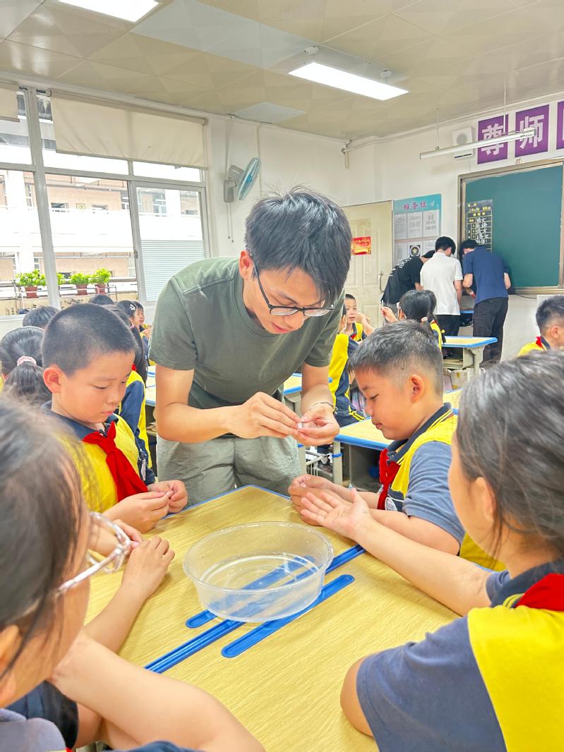 活动中,大学生志愿者践行“玩中学”理念,为该校三年级学生带来了两场趣味盎然的科普实验课,带领孩子们在体验“彩虹泡泡龙”与“马兰格尼效应”的过程中,将表面张力、流体力学等抽象知识转化为可动手操作、可观可感的趣味体验,让孩子们在吹泡泡、观气流的过程中亲身感受科学奥秘,激发探究热情。
