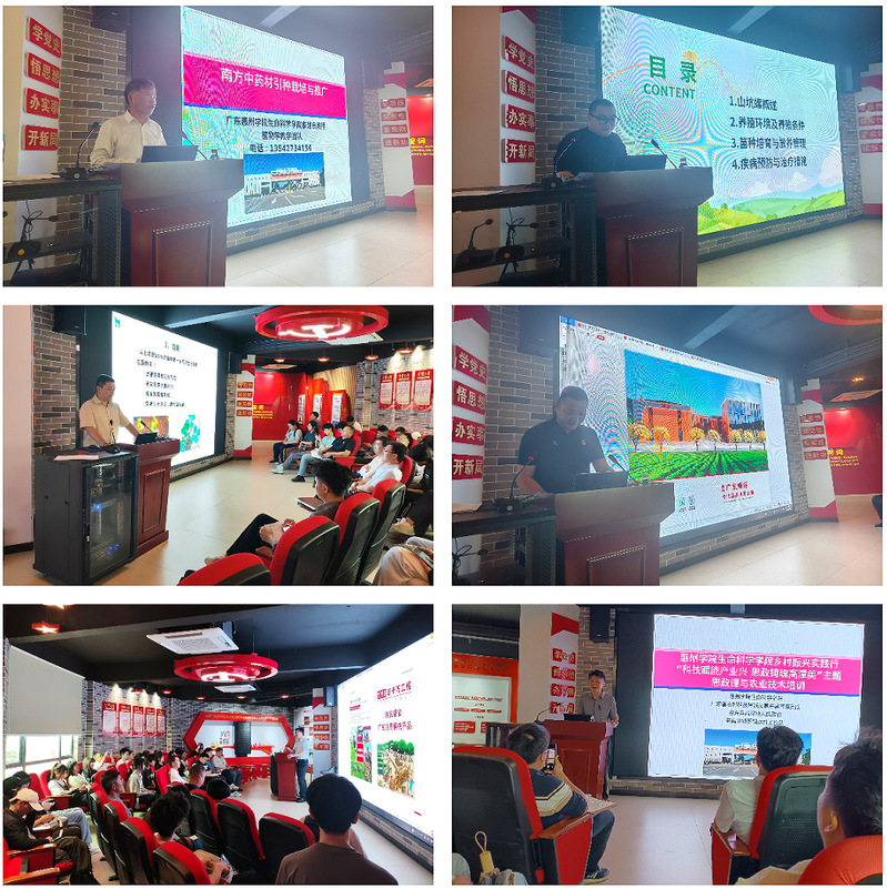 在农业技术培训环节,学院叶峭博士围绕山坑螺养殖展开讲解,系统介绍山坑螺的生态习性、养殖环境构建、种苗培育、病害防治及提质增效技术,为村民科学养殖山坑螺提供切实可行的技术参考。廖建良教授结合本地实际,介绍适合高潭种植的中药材品种,分析岭南道地中药材种植与开发前景,深入探讨“中药材+乡村振兴”模式对推动乡村产业发展的作用。陈勇智老师聚焦高潭镇气候和土壤条件,讲解花生新品种选择、高效栽培、肥水管理、主要病虫害绿色防控技术,并现场解答种植户关于种植花生的技术问题。许继成则介绍了广东顺苗公司的发展概况和主营业务,分析花生从种植到加工、销售的全景,分享品牌打造与市场拓展经验。他表示,将大力支持学院与高潭镇的深度合作,探索联农带农机制,带动农民增收致富。同时,他还鼓励师弟师妹们积极到顺苗公司实习就业,共同投身乡村全面振兴的伟大实践。