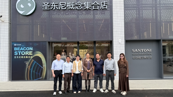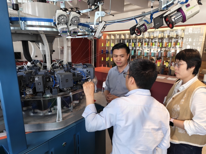 在盈云科技相关负责人陪同下,教师团队先后参观了智能织造车间、概念集合店与研发中心,实地调研无缝针织全流程生产链路。在生产车间,团队近距离观摩了国际先进的无缝圆纬机等智能设备运行原理,详细了解无缝塑身衣从纱线织造、结构成型到后整理的全工艺细节,并就3D一体成型技术、功能性面料应用、智能化生产管控等行业前沿技术与企业技术人员进行深入探讨。