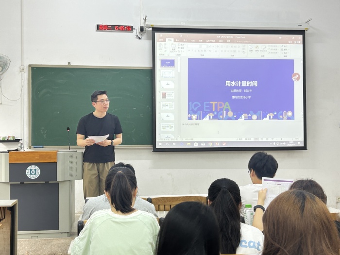 刘炎丰身兼市、区教研员及多个专业委员会理事职务,曾获省级第五届小学科学教学能力大赛一等奖。他以“过来人”的身份,真诚分享从教以来的探索、挑战与荣誉。基于对惠州市小学科学教育面临师资不足、课时不足、开课质量不高等现实问题的了解,他鼓励在座师范生学好专业、长期积累,指出从事小学科学教育“大有可为”。他特别提到,本届同学未来服务的博罗县基层正是科学教育的薄弱环节与需求高地,坚定了定向生扎根基层、服务乡村的教育情怀与专业自信。