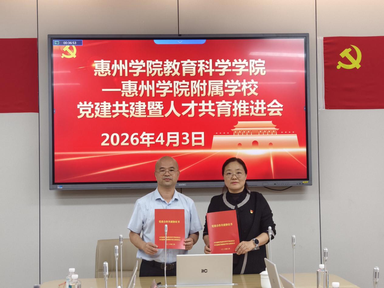 本网讯 为深化校地协同、强化党建引领,筑牢育人根基,推动树立和践行正确政绩观学习教育走深走实,4月3日上午,中共惠州学院教育科学学院委员会与中共惠州学院附属学校支部委员会,在惠州学院附属学校行政楼五楼会议室,举行党建共建暨人才共育推进会。惠州学院党委组织部正处级组织员、机关党委书记邓淑容,教育科学学院党委书记谢伟强,党委副书记、院长谢桂新,附属学校党支部书记、校长陈剑,双方党员代表参会。会议由惠州学院附属学校党支部副书记兼纪检委员徐文科主持。