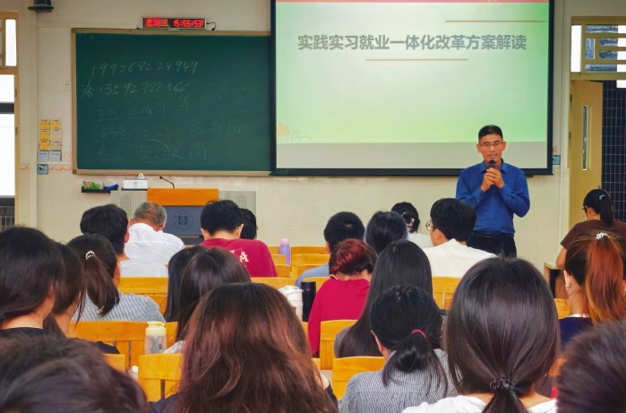 李普亮系统地解读了物流管理专业实践实习就业一体化改革政策。作为学校首批试点专业,物流管理专业率先将实践实习时长调整为一学年,推动实践教学深度融入人才培养全过程。他强调,学院将以提升学生实践能力、创新精神和就业竞争力为核心,构建“实践筑基——实习赋能——就业提质”一体化闭环育人通道,并提出三项举措:一是深化与星海物流等企业协同育人机制,拓展高质量实习就业基地;二是推动毕业论文“真题真做”,强化实习与毕业设计有机衔接;三是完善全流程实习管理与指导,确保实习质量与就业转化成效。