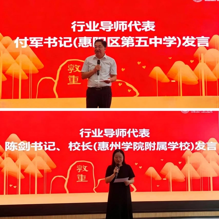 行业导师代表依次发言。惠阳区第五中学党总支书记付军分享了基础教育一线对高层次教育人才的需求导向,强调行业导师应助力研究生兼具理论深度与实践素养。惠州学院附属学校党支部书记、校长陈剑提出,行业导师应做好真实案例提供者、管理实践陪练员、职业成长引路人,聚焦研究生实践能力与职业素养培育。