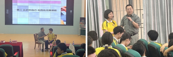 在面向初三学生的专场讲座中,何资桥以“自信中考,成就梦想”为主题,围绕压力认知、自我潜能激发、目标确立、心态调整等维度,为在场学生带来了一场干货满满的考前心理辅导。何资桥从初三学生常见的备考困惑入手,分析了考前心理调整不良等现象背后的心理机制,指出“考试不仅是知识的较量,更是心态的比拼”。他通过经典心理学案例,生动阐释了适度压力的积极作用,并现场教授了呼吸放松法等实用减压技巧。此外,何资桥在现场演示了催眠技术,让学生亲身体验潜意识的力量。