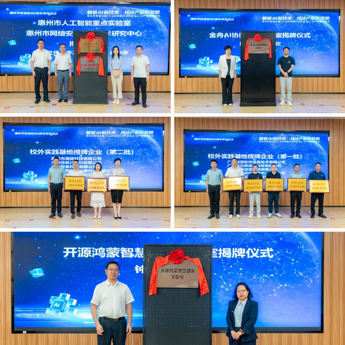 活动现场,与会领导嘉宾共同为“惠州市人工智能重点实验室”“惠州市网络安全工程技术研究中心”“开源鸿蒙智慧创客实验室”“金舟AI协同创新实验室”揭牌,并进行校外实践基地与研究生联合培养基地的授牌、研究生行业导师聘任、锐捷网络奖助金捐赠以及人工智能专委会专家聘任仪式。