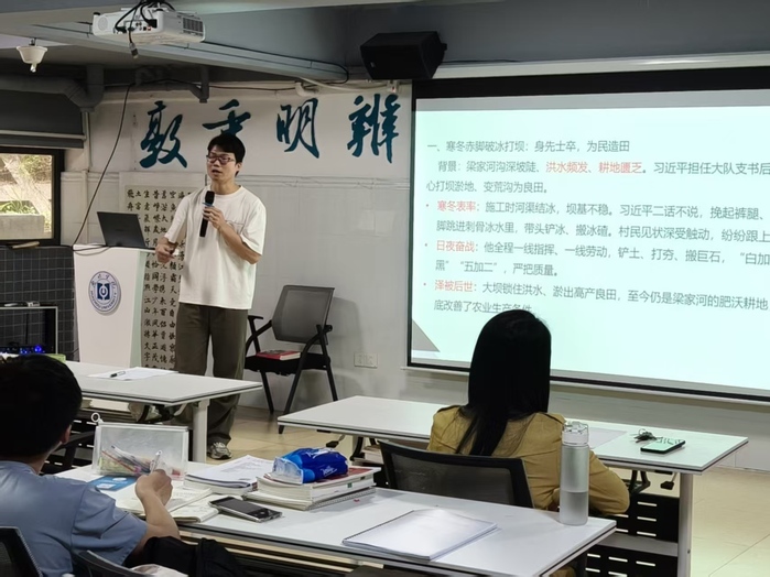 活动伊始,文学与传媒学院辅导员、多巴胺工作室主持人孙嘉创分享了《习近平的七年知青岁月》。他结合书中记载,讲述了习近平总书记从适应陕北艰苦环境到扎根基层、融入群众的实干历程,展现了青年时期在困境中坚守初心的精神风貌,引导在场师生感悟青年一代的责任与担当。