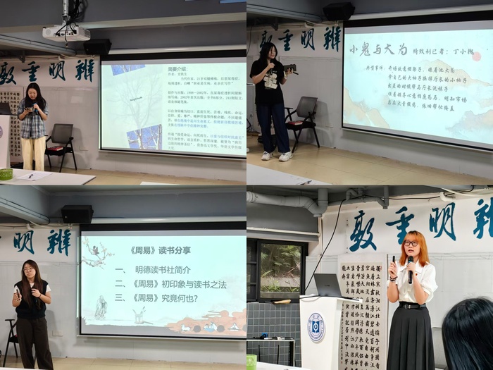 在学生分享环节,2024级汉语言文学专业的叶子绿结合自身感悟解读史铁生的《病隙碎笔》,探讨命运、苦难与生命的深刻哲思。2025级网络与新媒体专业的石张福瑞从“相遇、追溯、读懂、成长”四个维度解读《北上》,引导大家领略运河文化底蕴,感悟书籍与读者的精神共鸣。2025级汉语言文学专业的朱馨然分享了《沧浪之水》,聚焦主人公在现实与初心之间的挣扎与坚守,寄语有志考公的同学:适应规则更要守初心、怀正道、存信仰。2024级思想政治教育专业的张雅静介绍了明德读书社《周易》研读专题,解读“简易、变易、不易”三大思想,引导大家从传统文化中汲取智慧。